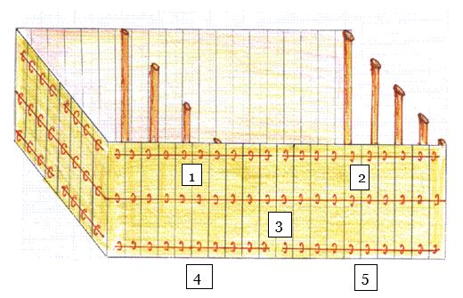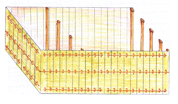 Here is a drawing of the Bars and Rings. Note the five bars on each side. There is a short bar, one long central bar, and another short bar. Biblical scholars say the Central bar represents Yeshua. He is the Center of the Gospel and the Strength of the Tabernacle.